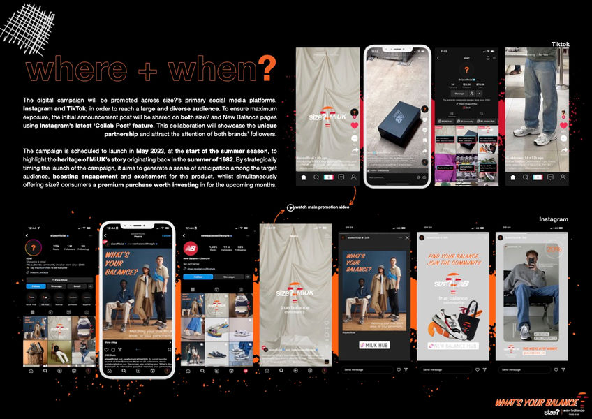 I developed the concept "What's Your Balance?" with a social media campaign in mind. It is a highly participatory campaign that utilises a swipe questionnaire to categorise consumer lives into one of five personalities. The marketing strategy, which specifically targets Gen Z, intends to draw interest in the more expensive collection among a group of consumers who may not have previously looked into purchasing from.The campaign incorporates the community chat forum 'True Balance' to bring like-minded people together and foster a sense of community among sneaker-heads.